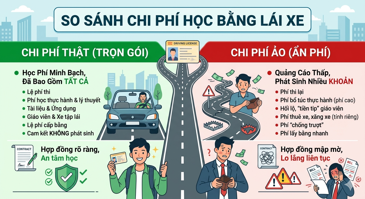 So sánh học bằng lái xe ô tô về chi phí trọn gói và chi phí rẻ ban đầu