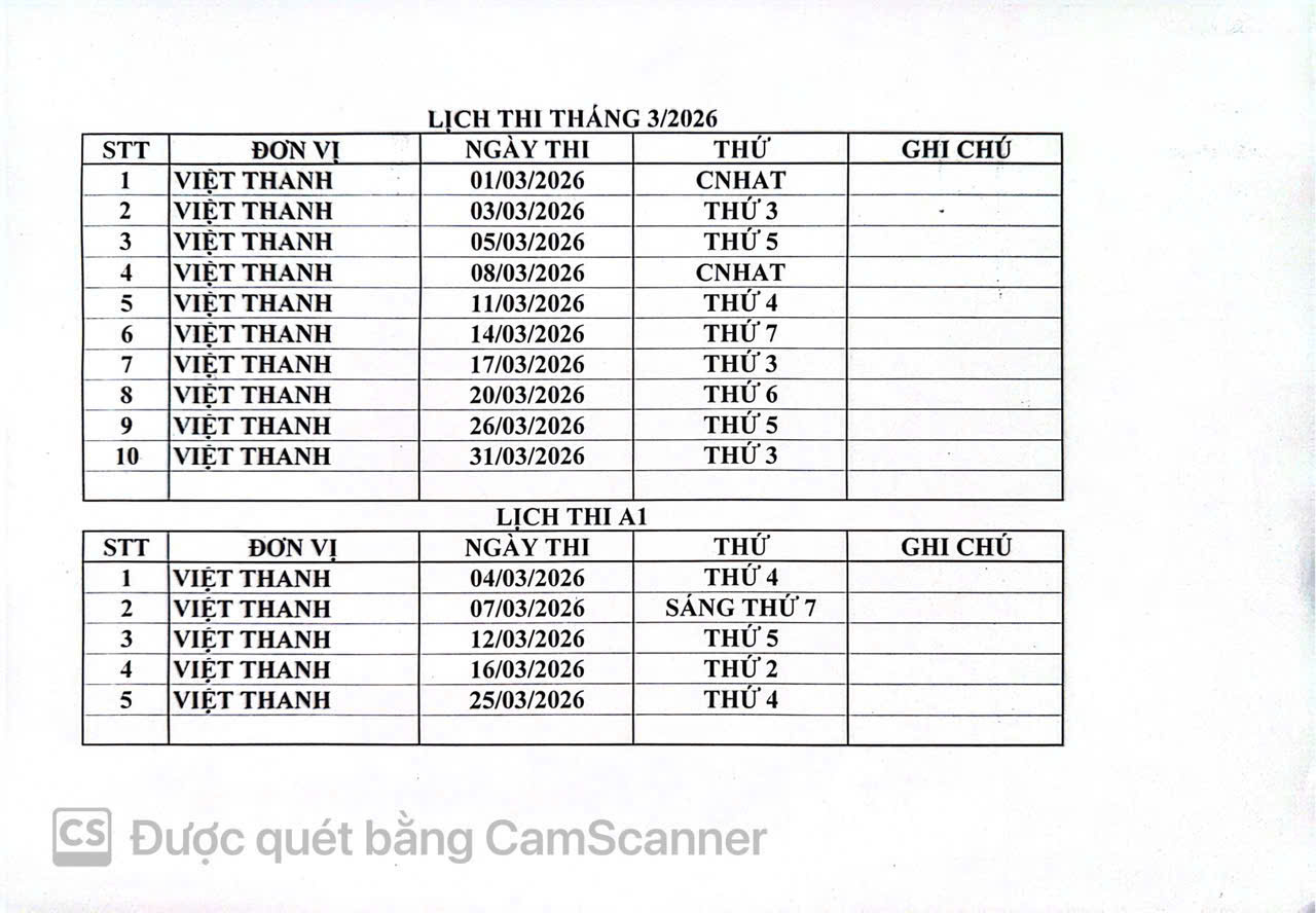 LỊCH THI SÁT HẠCH TRƯỜNG VIỆT THANH THÁNG 3 NĂM 2025